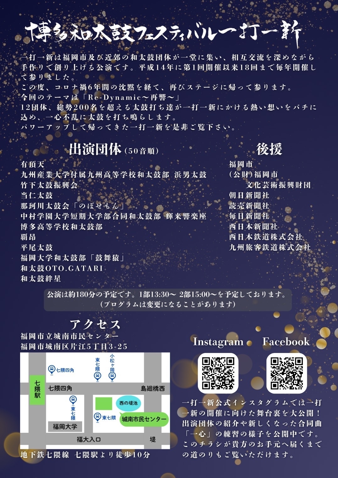 福岡市及び近郊の和太鼓団体が一堂に集い、相互交流を深めながら手作りで創り上げる公演です。この度、コロナ禍6年間の沈黙を経て再びステージに帰って参ります。