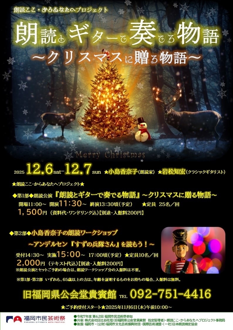 クリスマスの時期にぴったりの名作文学を、朗読とクラシックギターのコラボレーションでお届けする朗読公演です。福岡を拠点に活動する、プロの朗読家・小島香奈子とプロのクラシックギタリスト・岩松知宏がお届けする特別な時間を、どうぞお楽しみください。