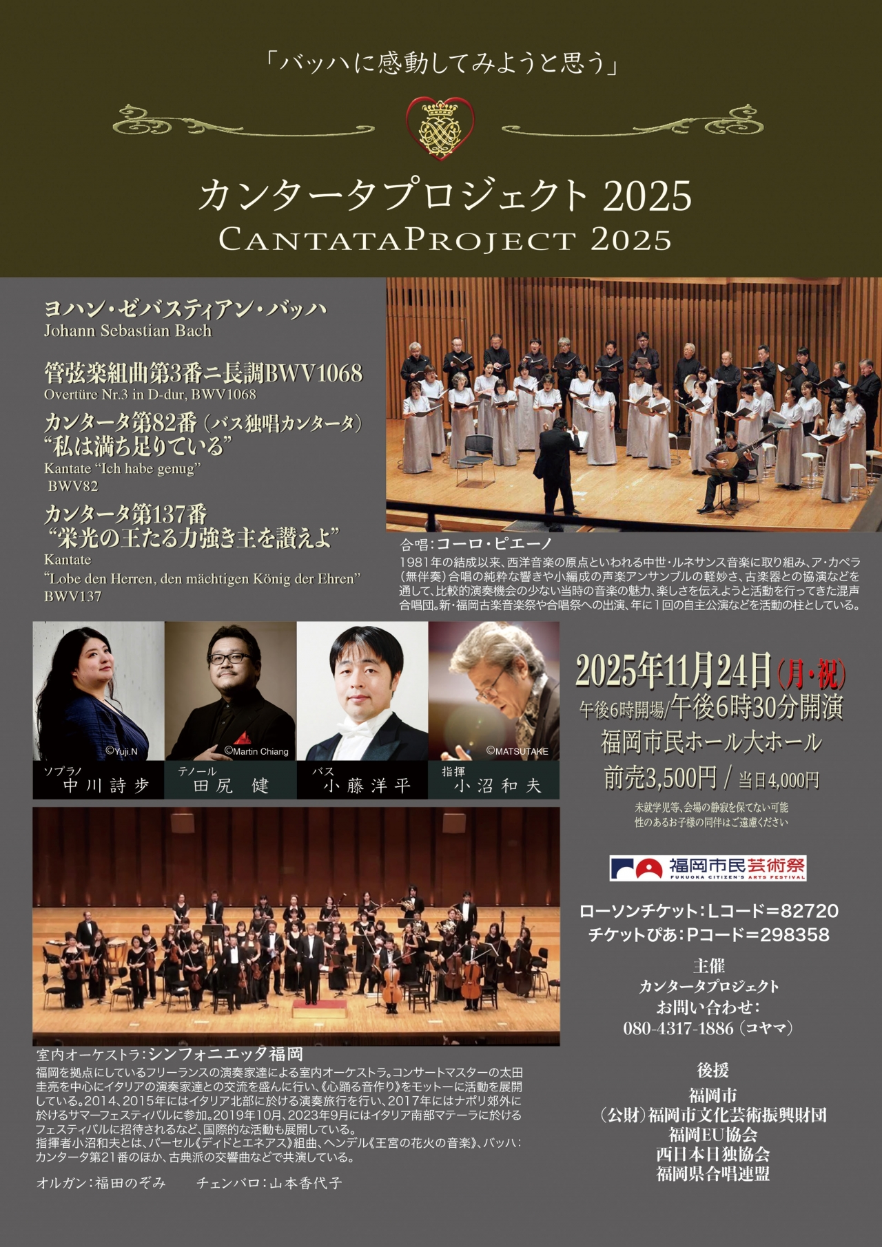 カンタータプロジェクトはバッハの時代の演奏法を再現し、福岡の音楽愛好家にカンタータを楽しんでいただく企画です。今回は、加えてバッハの作品の中ではよく知られた名曲を集め、より直感的で、心を動かされるバッハを目指しました。副題の「バッハに感動してみようと思う」にはそのような思いが込められています。