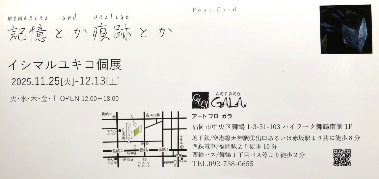 | 会場 | アートプロ ガラ https://lolipop-artpro-gala.ssl-lolipop.jp/ 〒810-0073 福岡市中央区舞鶴1-3-31-103ハイラーク舞鶴 南側1階 地下鉄/空港線天神駅①出口あるいは赤坂駅より共に徒歩8分 西鉄電車/福岡駅より徒歩10分 西鉄バス/舞鶴1丁目バス停より徒歩2分 ※Googleマップの仕様により場所名が異なって表示される可能性があります |