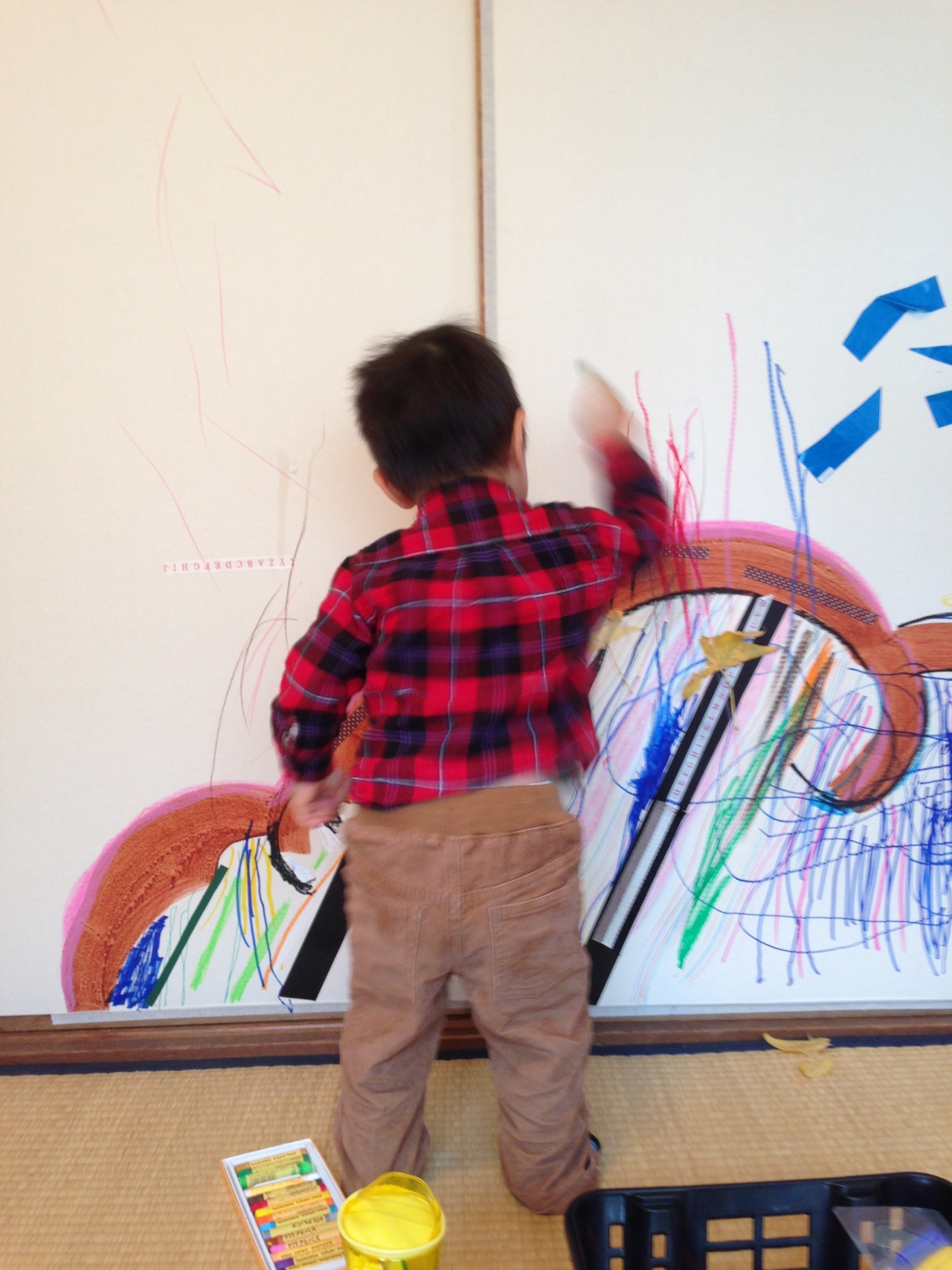 ①『えがく』1部屋の中で、絵具・クレヨン・ペン・シール・貼れるものなんでもで、