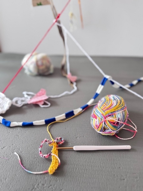 ②『つなぐ』1部屋の中で、毛糸・糸・布などつなげることができるものなんでも、