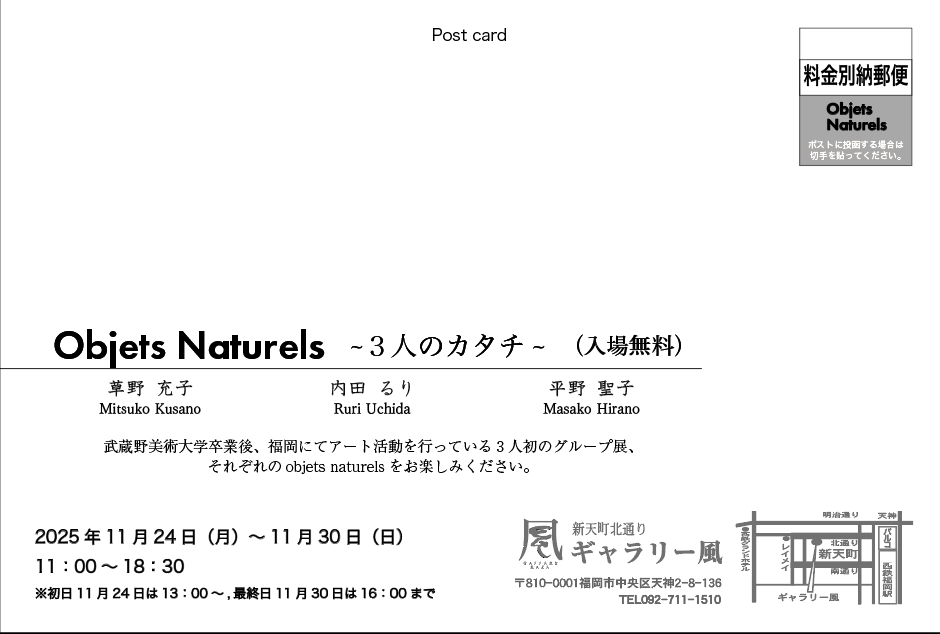 会場 | ギャラリー風 http://artwind.jp/ 〒810-0001 福岡県福岡市中央区天神2-8-136 新天町商店街 北通り 西鉄バス停:協和ビル前 徒歩5分 市営地下鉄:天神駅徒歩7分 ※Googleマップの仕様により場所名が異なって表示される可能性があります |