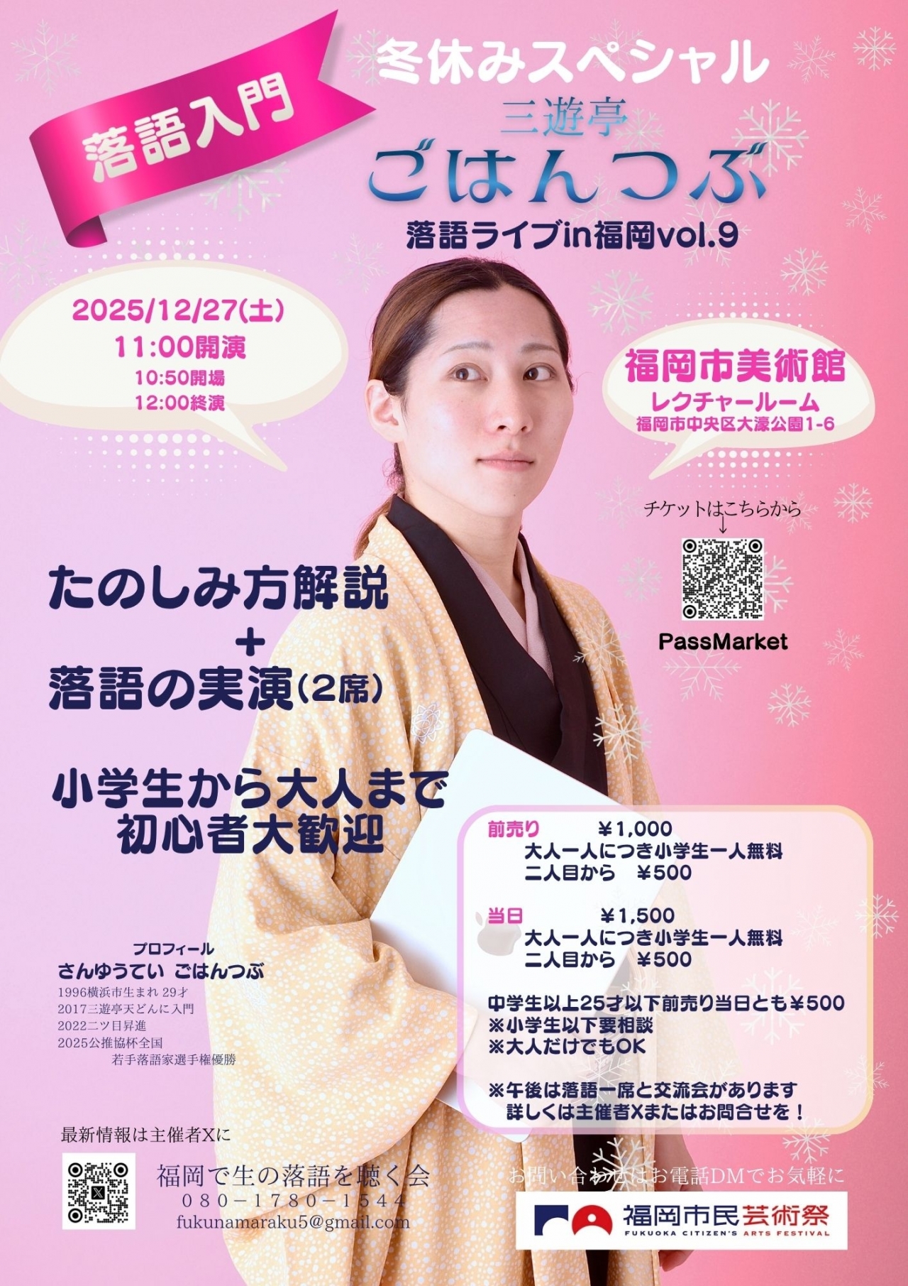 有料 午前の部 前売り1,000円 当日1,500円 大人一人につき小学生一人無料、二人目から500円/人 中学生以上25才以下前売り当日とも500円 |