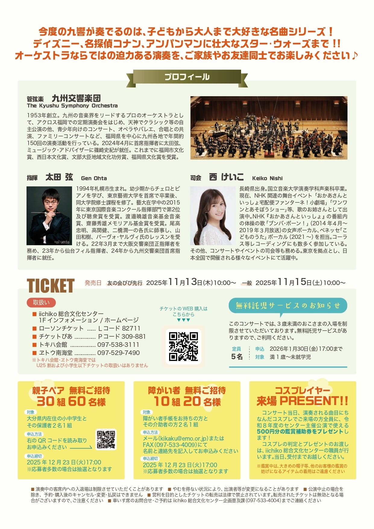 | お申込み | ・iichiko総合文化センターホームページ (https://emo.or.jp/event/9875/) ・iichiko総合文化センター1Fインフォメーション ・トキハ会館 3階 プレイガイド ・ヱトウ南海堂 ・チケットぴあ(P:309-881) ・ローソンチケット(L:82711) |