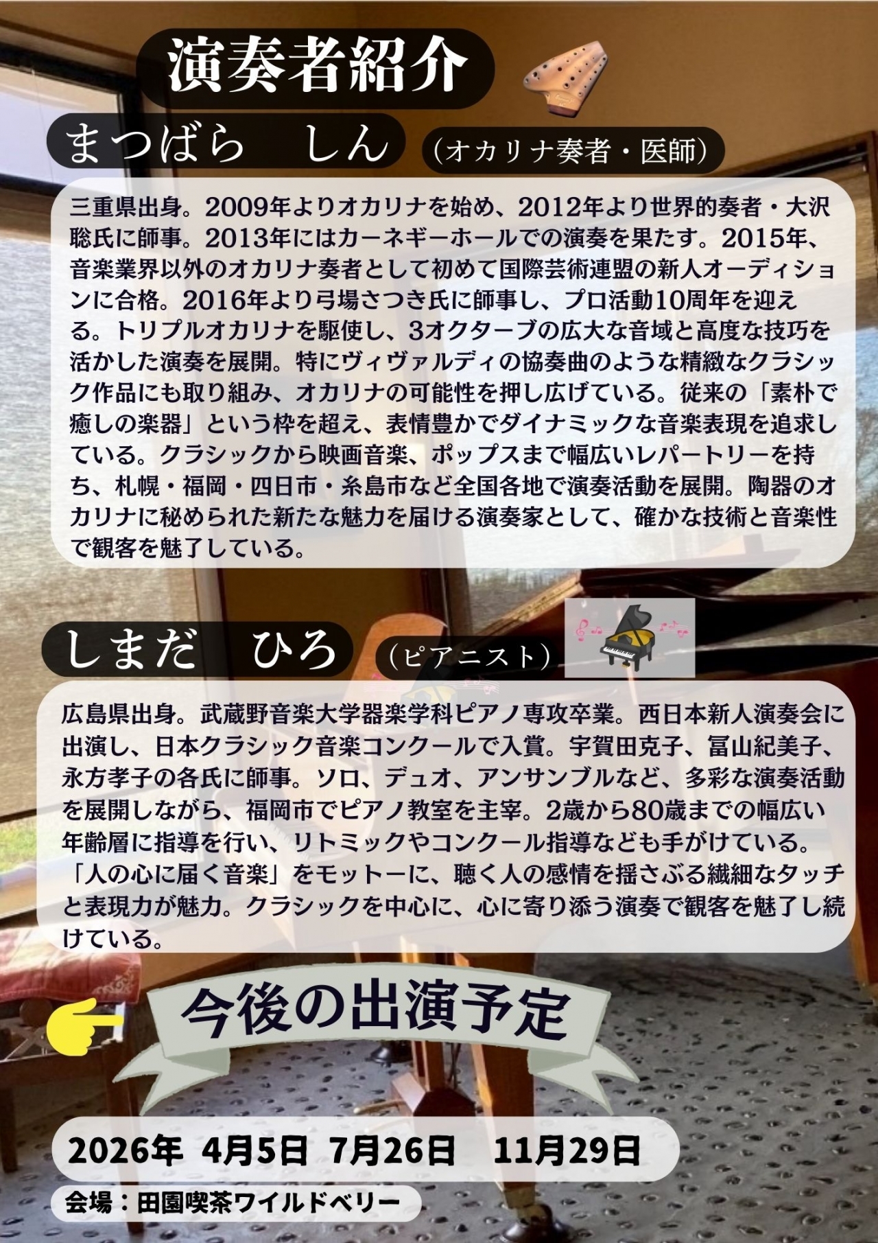 オカリナ奏者:松原慎とピアニスト:嶋田ヒロのデュオによるオカリナとピアノのコンサート。クラシックから唱歌、ポップスまで幅広く演奏。日没の夕陽を背景に、ケーキセットと共に、ベーゼンドルファーのピアノと石畳に響くオカリナの響きをお楽しみ頂ける会です。