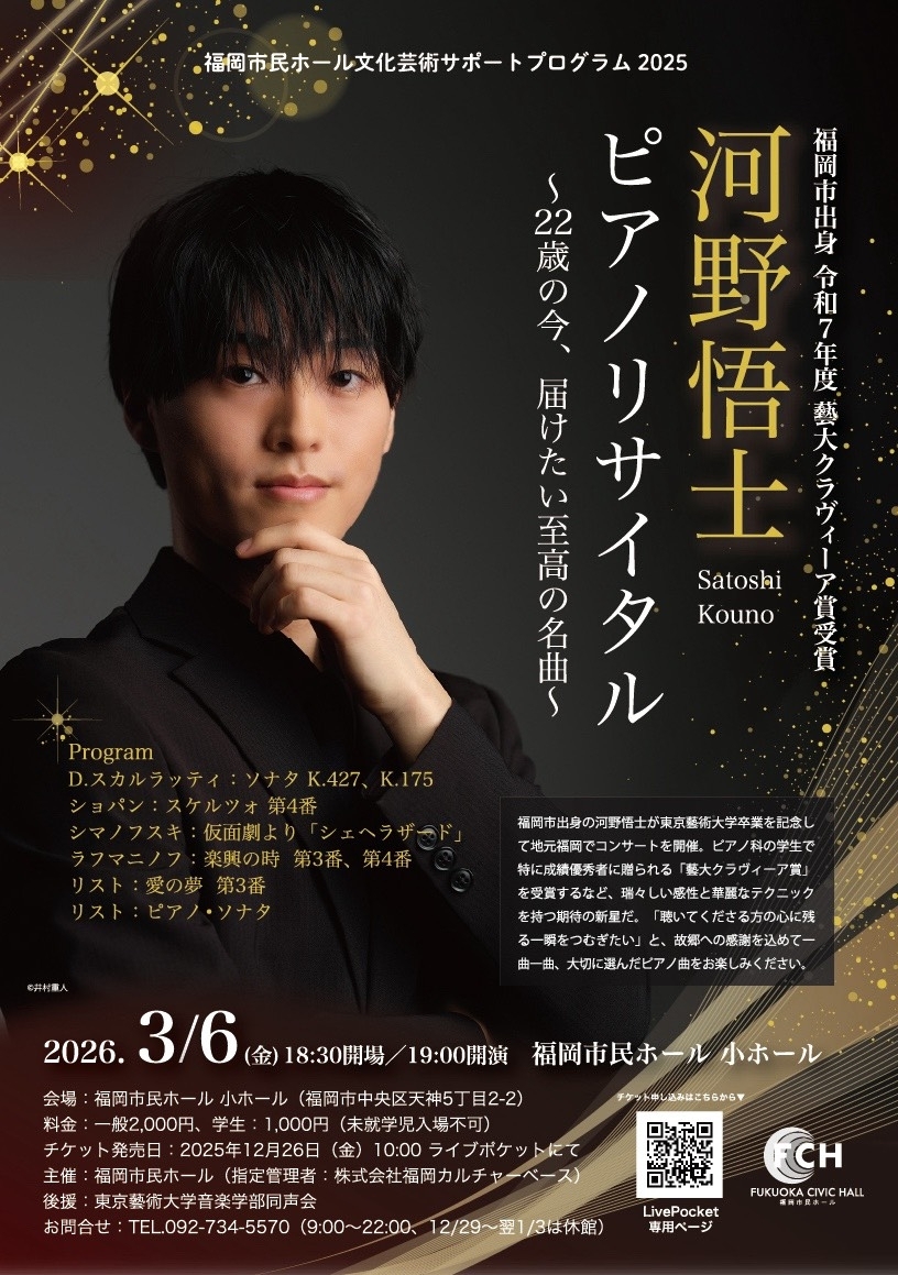 福岡市出身の河野悟士が、東京藝術大学卒業を記念して地元福岡でコンサートを開催。ピアノ科の学生で特に成績優秀者に贈られる「藝大クラヴィーア賞」を受賞するなど、瑞々しい感性と華麗なテクニックを持つ22歳が、クラッシック至高の名曲をお届けします。
