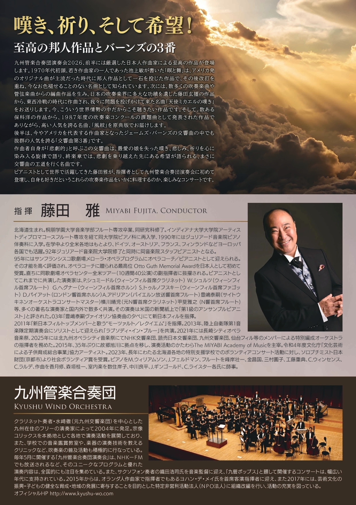後半は、今やアメリカを代表する作曲家となったジェームズ•バーンズの交響曲の中でも抜群の人気を誇る「交響曲第3番 」 です。作曲家自身が悲劇的と呼ぶこの交響曲は、最愛の娘を失った嘆き、悲しみ、祈りを心に染み入る旋律で語り、終楽章では、悲劇を乗り越えた先にある希望が語られる、まさに交響曲の王道を行く名曲です。ピアニストとして世界で活躍してきた藤田雅が、指揮者として九州管楽合奏団に初めて登壇し、自身も好きだというこれらの吹奏楽作品をいかに料理するのか、楽しみなコンサートです。