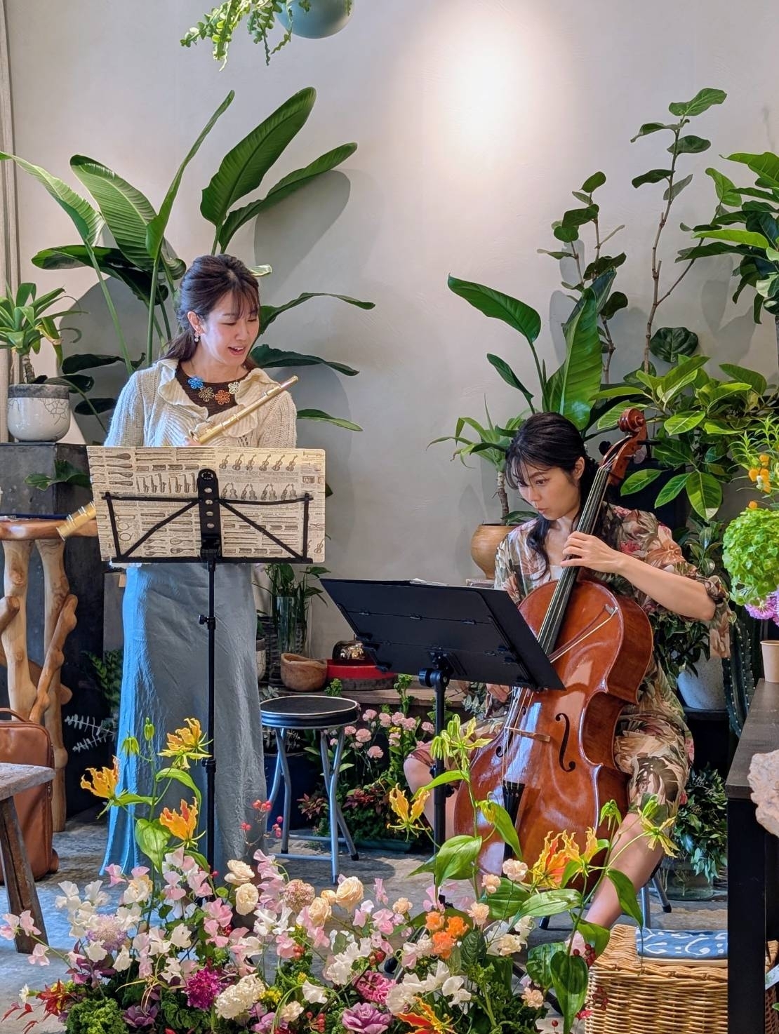 お花屋さんで季節ごとに開催しているコンサート。季節のお花に囲まれてフルートとチェロのデュオをお楽しみください!