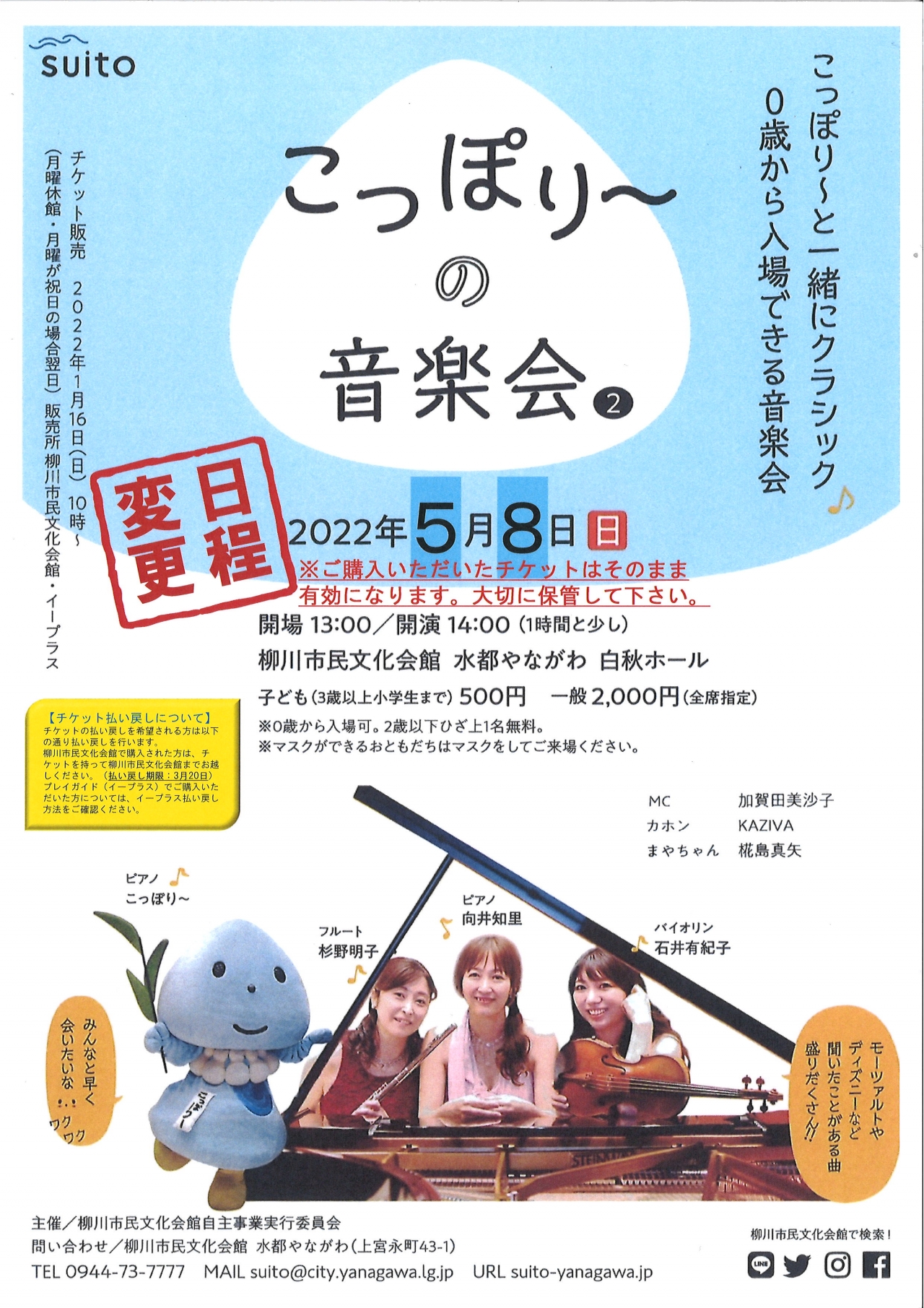 この度、令和4年3月6日(日)柳川市民文化会館白秋ホールにおきまして開催を予定しておりました「こっぽり~の音楽会2」は、新型コロナウイルスの感染拡大防止のため公演を令和4年5月8日(日)に延期することにいたしました。