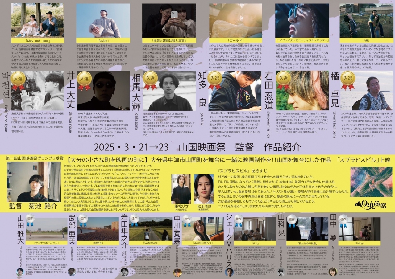 ● 公募によるインディーズ映画の中から選りすぐった作品を上映します。本年度は応募作品155本の中から優秀作品6作品(『ゴールド』『本音と建前は嘘と真実』『ライフ・イズ・ビューティフル・オッケー』『姿』『May and June』『fusion』)、佳作7作品(『私たちの千秋楽』『あの灯に帰ろう』『サヨナラホームラン』『チコ』『緑閃光』『Living』『Switchback』)が上映されます。優秀作品上映後には監督登壇、質疑応答があります。上映作品の中から「山国映画祭グランプリ」と「観客賞」を決定します