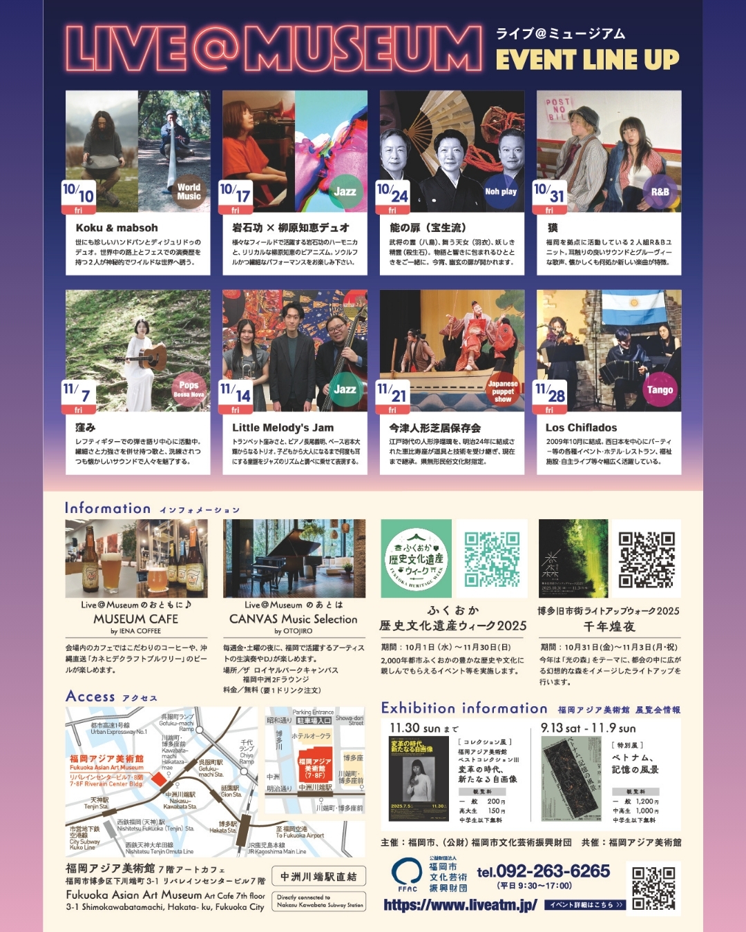 毎週金曜18時半からアジア美術館で「Live@Museum」を開催中。週替わりでポップスやジャズ、伝統芸能などさまざまなジャンルのライブを行います。観覧は無料。