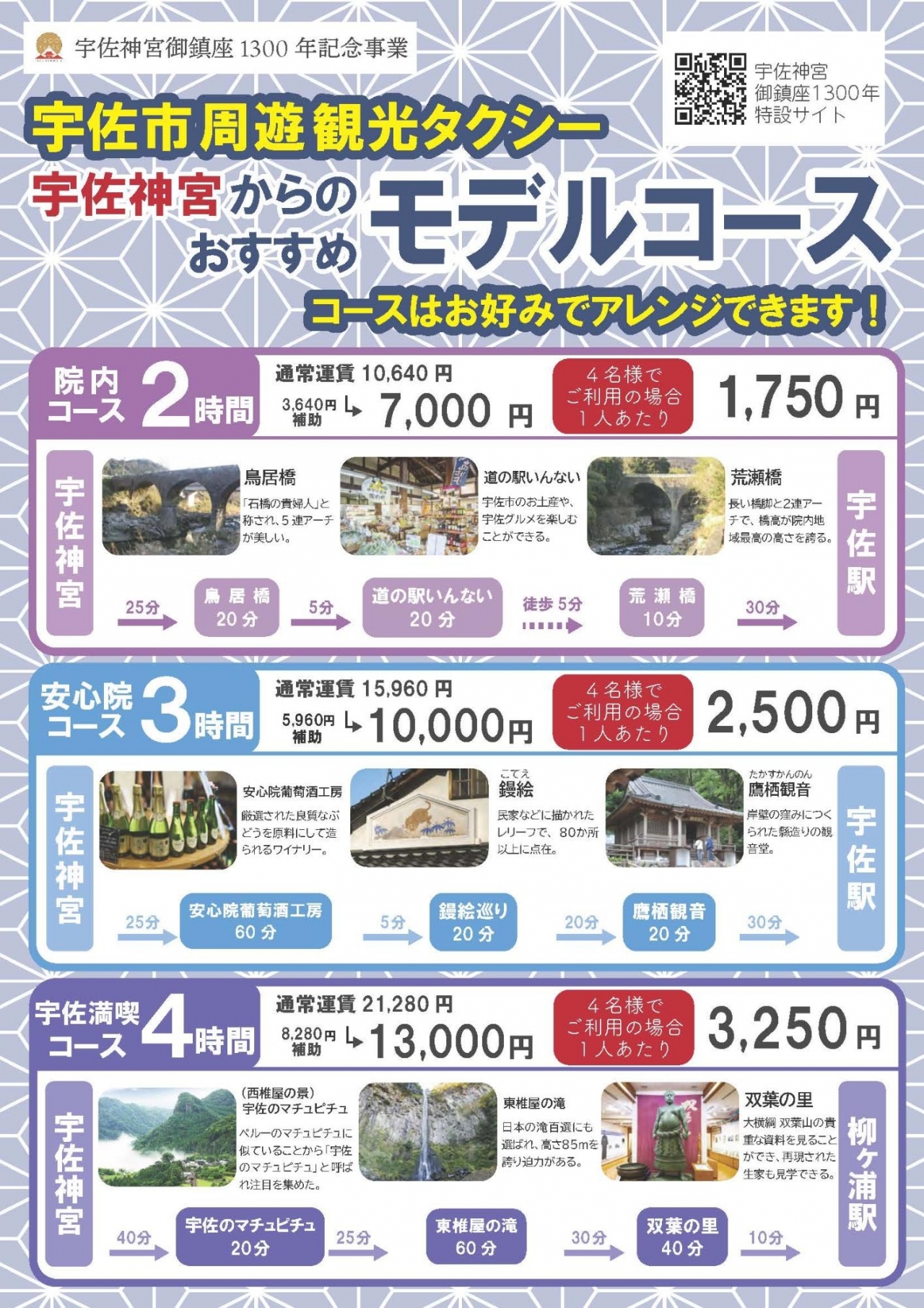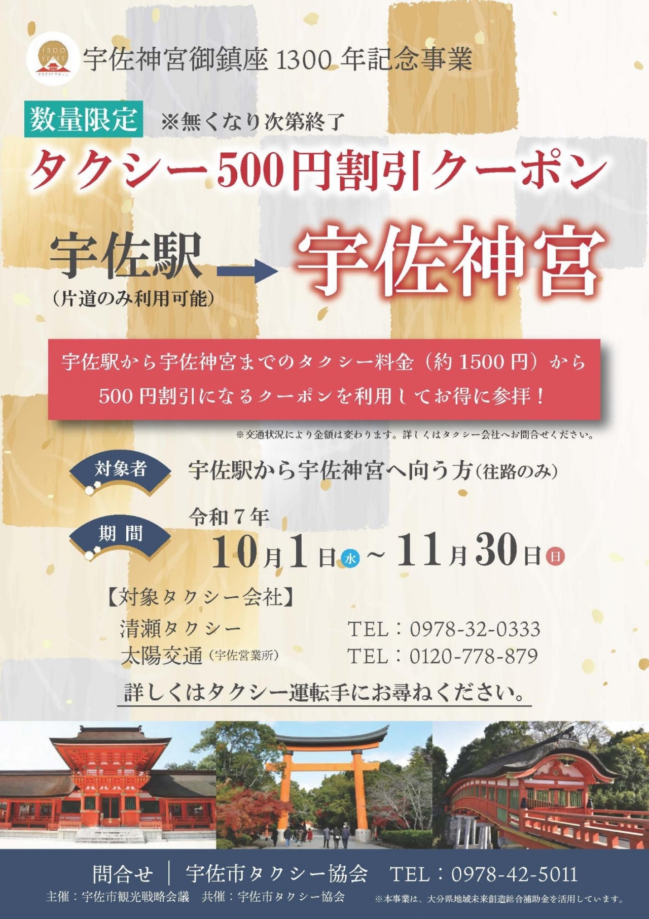 宇佐神宮の御鎮座1300年は、まさに今しか体験できない節目の行事。しかもタクシー補助を活用すれば、時間もお金もスマートに使いながら、宇佐のまちを深く味わえます。枠には限りがあるため、早めの予約がおすすめです。