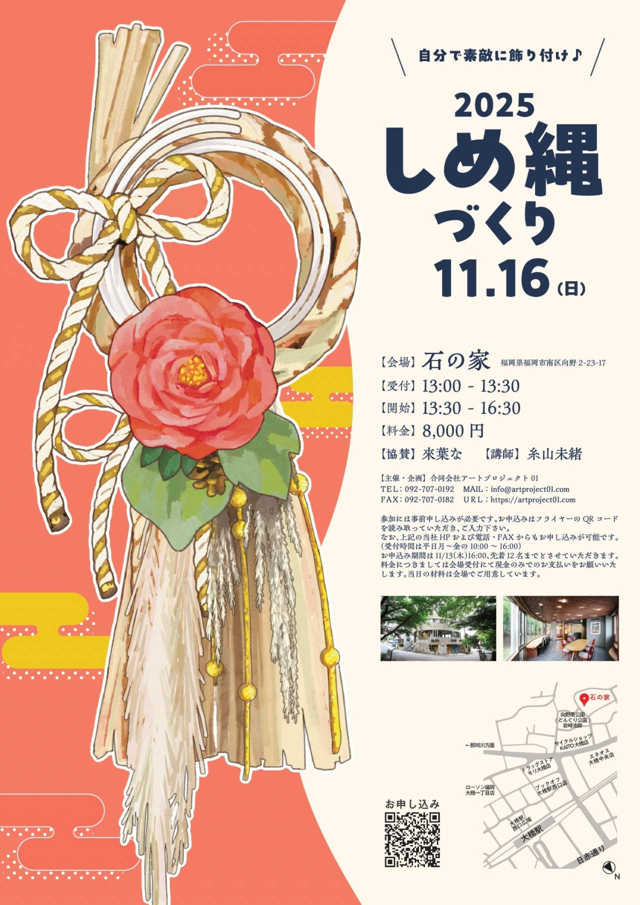 | 会場 | 石の家 https://www.spacemarket.com/spaces/ishinoie/ 〒815-8799 福岡県福岡市南区向野2丁目23-17 西鉄天神大牟田線 高宮駅 徒歩16分 西鉄天神大牟田線 大橋駅 徒歩7分 ※Googleマップの仕様により場所名が異なって表示される可能性があります |