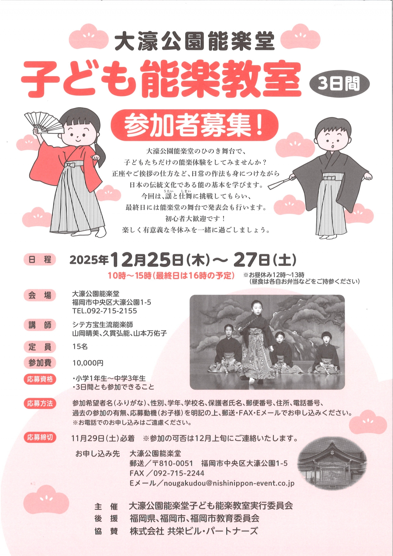 | お申込み | 応募資格 ・小学1年生~中学3年生 ・3日間とも参加できること 応募方法 ・参加希望者名(ふりがな)、性別、学年、学校名、 保護者氏名、郵便番号、住所、電話番号、 過去参加の有無、応募動機(お子様)を明記の上 Eメール・郵送・FAXのいずれかでお申込みください。 ※お電話でのお申込みはご遠慮ください 応募締切 ・11/29(土)必着 ※参加の可否は12月上旬にご連絡いたします お申込み先 大濠公園能楽堂 Eメール:nougakudou@nishinippon-event.co.jp 郵送:〒810-0051 福岡市中央区大濠公園1-5 FAX:092-715-2244 |