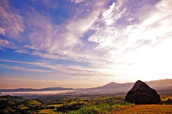 旅の締めくくりに訪れたのは、小萩山稲荷神社の展望台「草原テラス」です。駐車場から少し歩くと、緩やかな丘の上に広がる草原が姿を見せます。足元の草が風に揺れ、遠くには阿蘇山の雄大な景色。