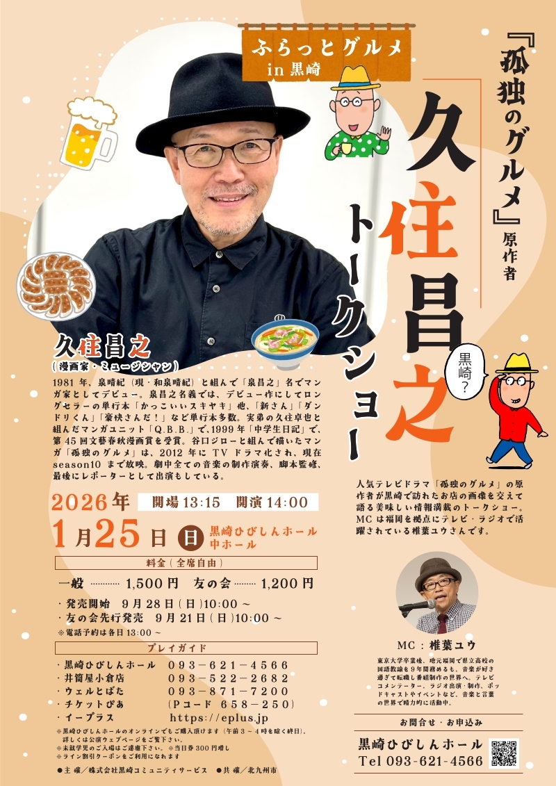 人気テレビドラマ「孤独のグルメ」の原作者が黒崎で訪れたお店の画像を交えて語る美味しい情報満載のトークショー。MCは福岡を拠点にテレビ・ラジオで活躍されている椎葉ユウさんです。