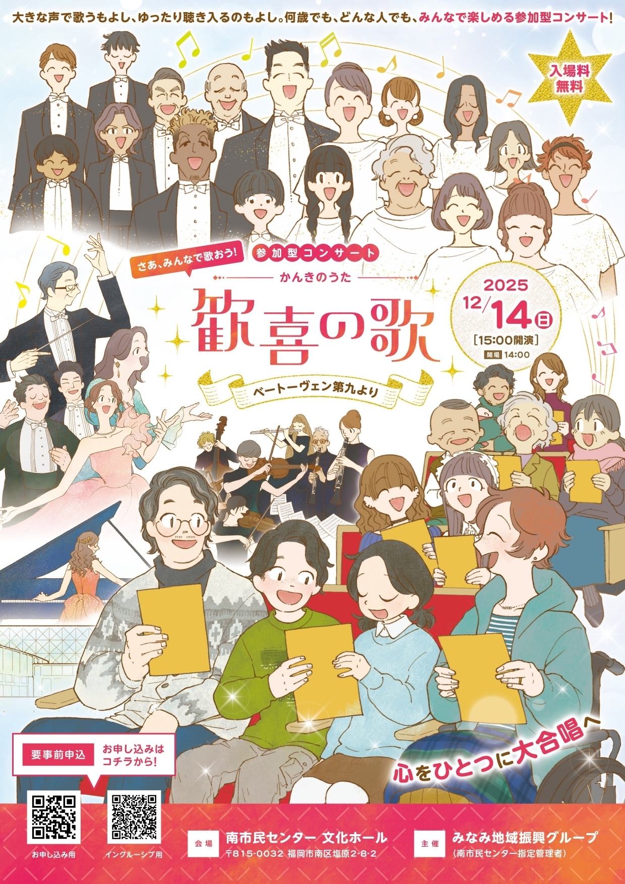 音楽の力はあらゆる人々をつなげてくれます。当日の練習(第1部)で、客席から一緒に合唱に参加できます。
