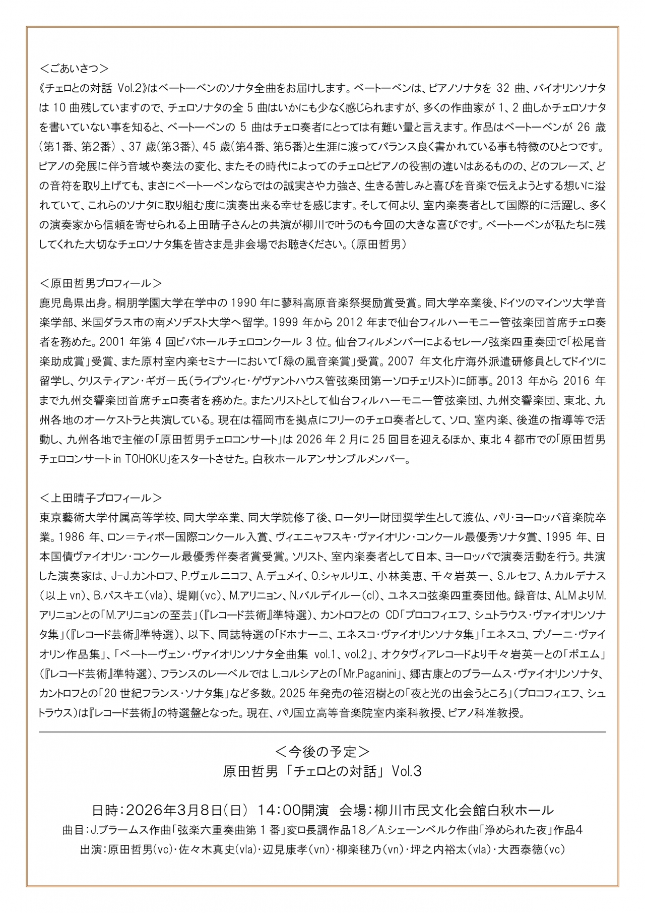 仙台フィル、九州交響楽団の首席奏者を歴任した原田哲男とパリを拠点に国際的に活躍するピアニスト上田晴子によるベートーヴェンチェロソナタ 全曲リサイタル