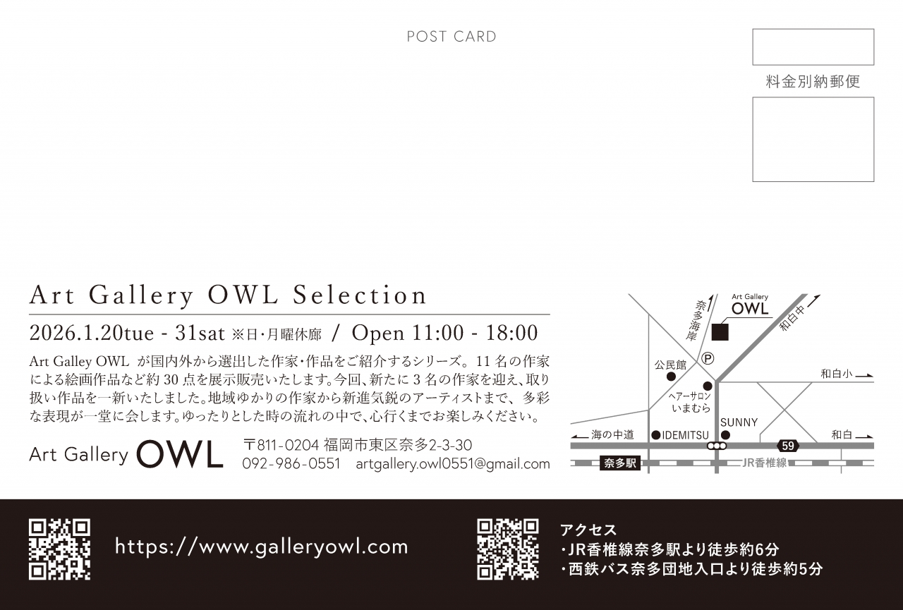 | 会場 | Art Gallery OWL https://www.galleryowl.com 〒811-0204 福岡県福岡市東区奈多2-3-30 JR香椎線奈多駅より徒歩約6分 西鉄バス奈多団地入口より徒歩約5分 ※Googleマップの仕様により場所名が異なって表示される可能性があります |