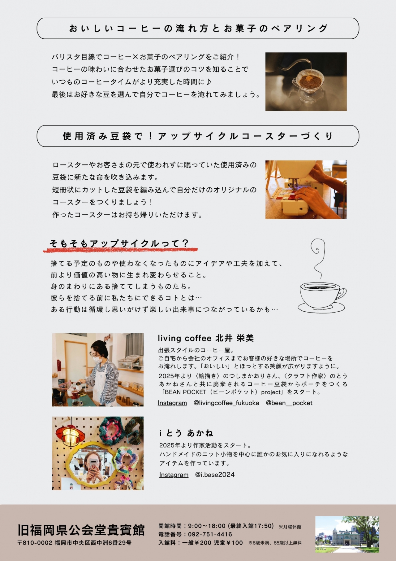 予約制:コーヒーの淹れ方とお菓子のペアリング、アップサイクルコースター作り(講座とワークショップ)