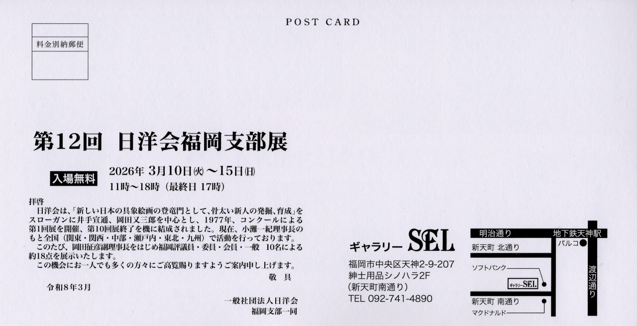 | 会場 | ギャラリーSEL 福岡市中央区天神2丁目9-207紳士用品シノハラ2F(新天町南通り) 地下鉄天神駅下車2分 ※Googleマップの仕様により場所名が異なって表示される可能性があります |