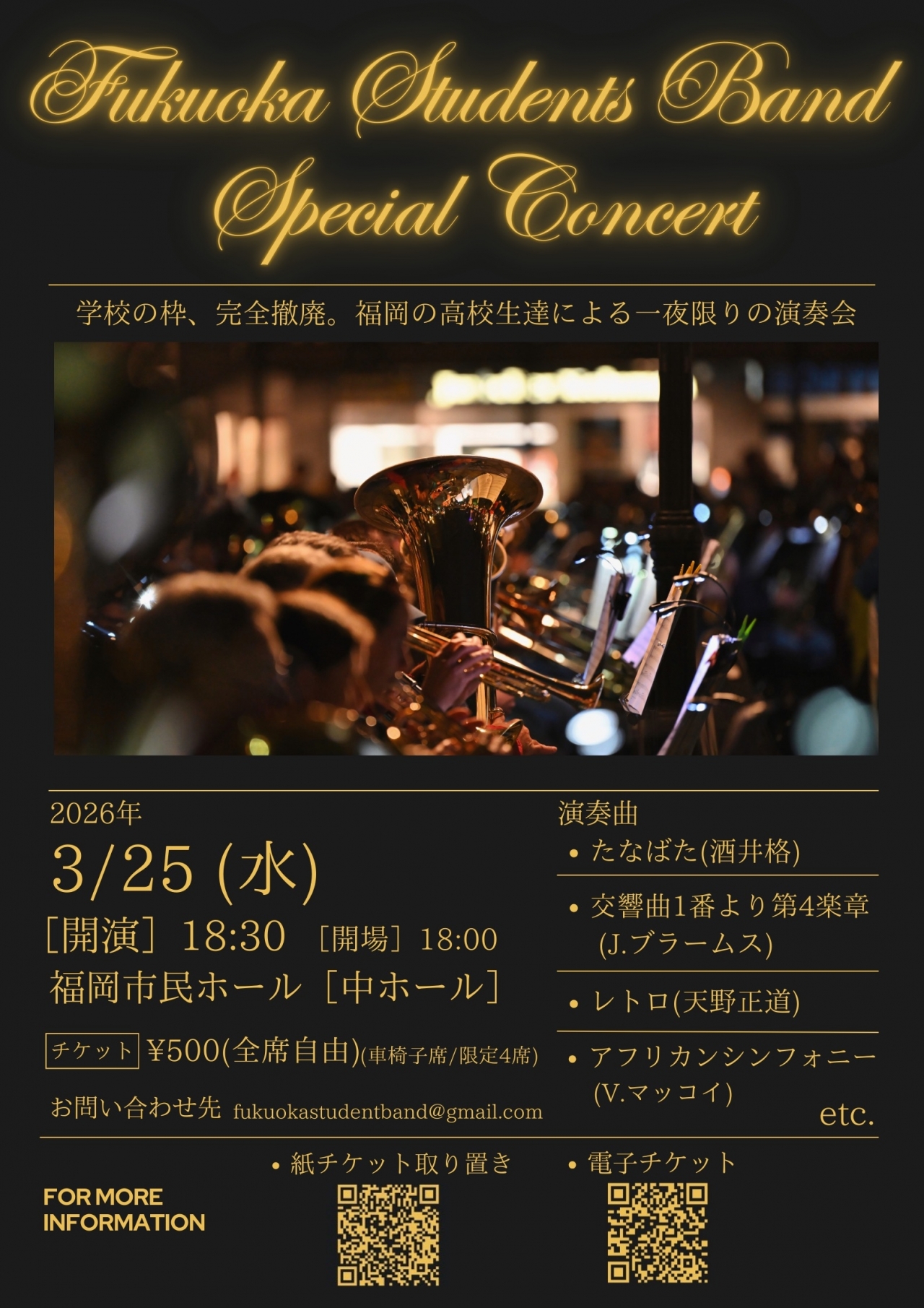 Fukuoka Student Band は、福岡県内の高校生が集まり、企画・演奏・運営のすべてを高校生自身で行う団体です。