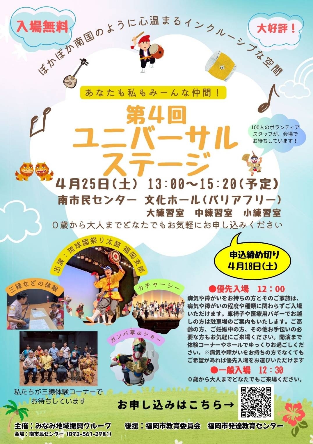 琉球國祭り太鼓福岡支部によるエイサーをご覧いただけます。0歳から大人の方までどなたでもご参加いただけます。全席自由、入場無料です。本イベントは、病気や障がいをお持ちの方にさまざまな配慮を行います。車椅子や医療用バギーで観覧できるお席もございます。車椅子や医療用バギーをご利用の方のスペースに限りがあるため、申し込み状況によっては座席の確保が難しい場合もございますが、会場にはさまざまな体験のコーナーもあり、座席の確保が難しい場合でも会場内でお楽しみいただける内容となっております。準備の都合上、病気や障がいがあるなしに関わらず、ご参加いただく全員の申し込みが必要となります。安全を考慮して、申し込みが500名を超えたら締め切らせていただくことがあります。お早めにお申し込みください。