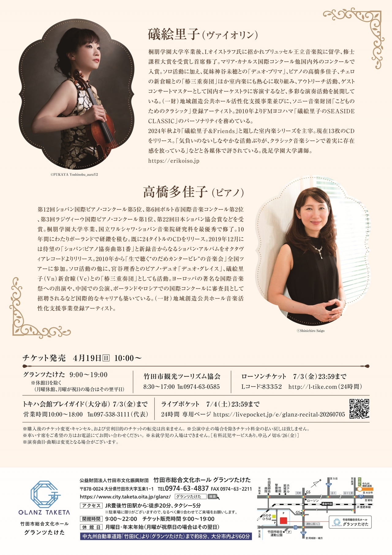 | お申込み | <チケット取扱> ●グランツたけた窓口 ●竹田市観光ツーリズム協会 ●トキハ会館プレイガイド(大分市) ●ローソンチケット(Lコード:83352) ●ライブポケット https://livepocket.jp/e/glanz-recital-20260705 |